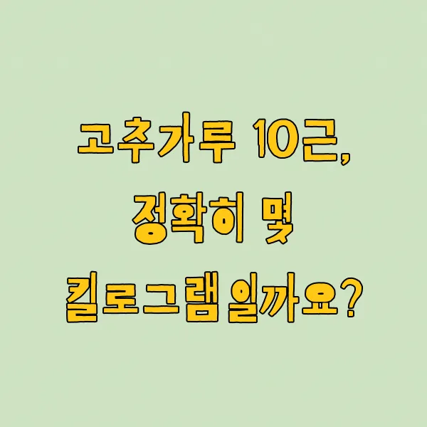 일반적으로 우리나라에서 '1근'이라고 하면 600g을 의미하는 경우가 많아요. 시장에서 채소나 과일을 살 때도 '한 근 주세요'라고 하면 보통 600g으로 맞춰주시곤 하죠. 그래서 산술적으로 계산하면 고추가루 10근은 10 곱하기 600g, 즉 6kg이 되는 게 맞아요. 저도 처음에는 그냥 6kg이라고 생각했었답니다.
